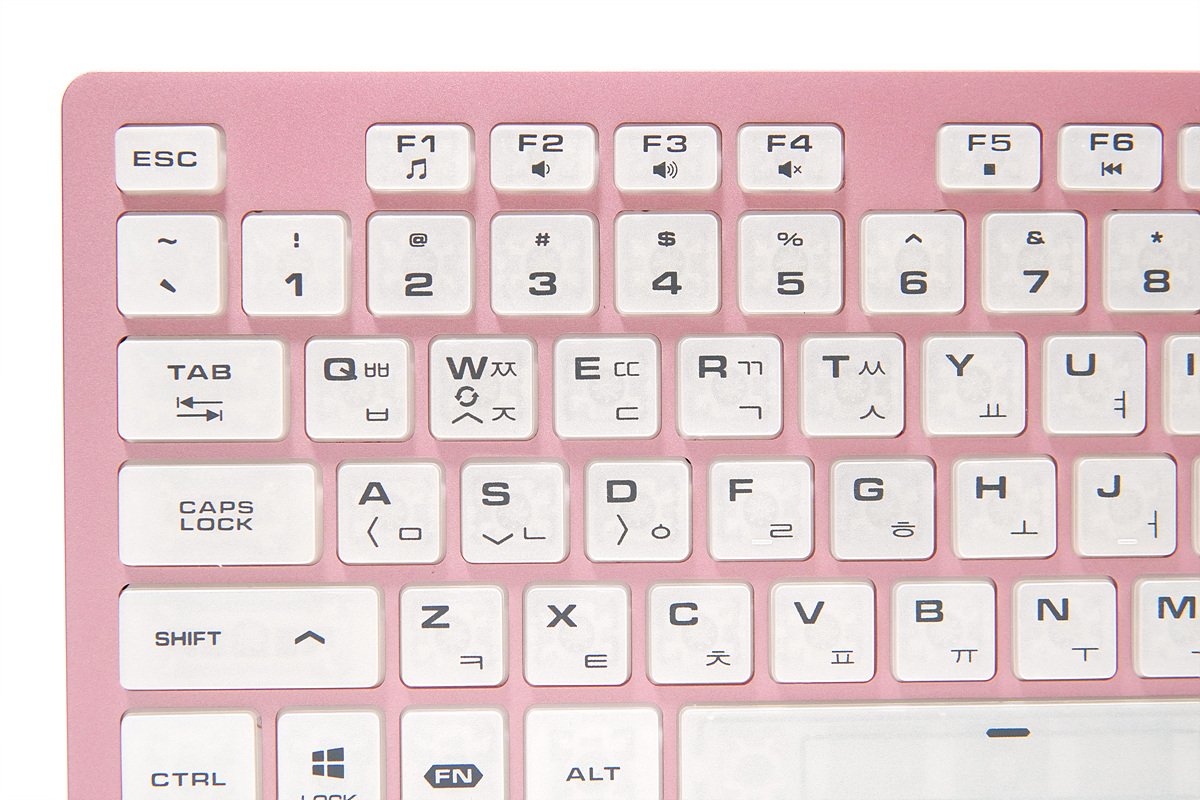 풀 배열의 일반적인 레이아웃으로 보이지만 사실 104+1=105 키(Key)의 조금은 독특한 배열을 가지고 있습니다. 왼쪽 윈도우 키와 Alt 키 사이에 FN 키가 있으며 오른쪽에는 한/영, 한자 키가 배치되어 있습니다. 표준 배열이 있는데도 불구하고 왜 이런 독자 배열을 하는 건지 잘 모르겠네요. 기계식 키보드처럼 키캡 놀이의 문제가 아니라 익숙하지 않은 배열이라 단축키 작업에서 오타가 제법 나는 편이었습니다.