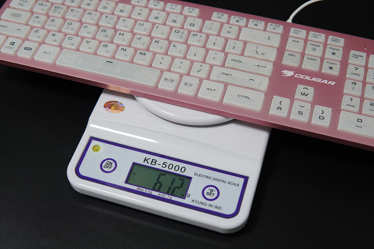 케이블을 제외하고 612g으로 측정되었습니다. 알루미늄 하우징이지만 키보드의 두께(높이)와 키캡으로 인해서 기계식 키보드에 비해서는 가벼운 편입니다.