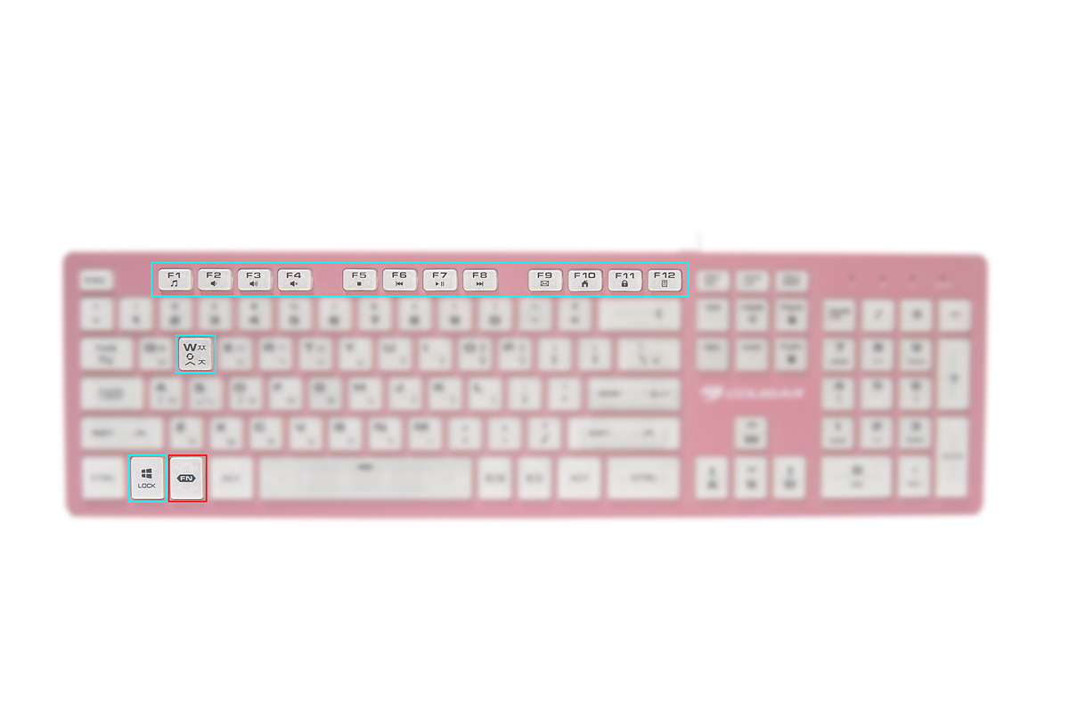 키캡 모서리는 라운드로 마감이 되었으며 키캡에는 멀티미디어, LED 기능이 표시되어 있습니다.