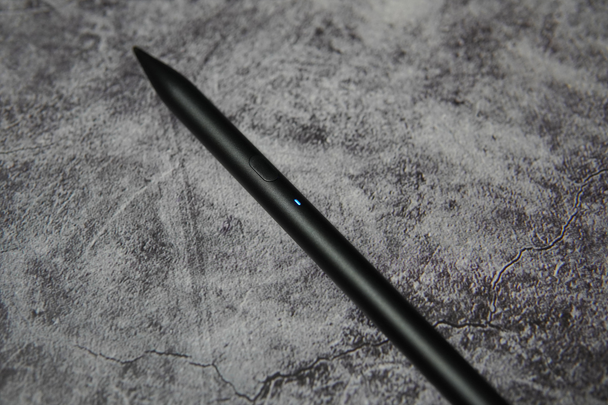앞쪽의 버튼을 누르면 파란색 LED가 켜지면서 바로 사용할 수 있습니다. 애플 펜슬과 다르게 초기에 페어링(등록)을 해줄 필요 없이 전원 버튼을 한번 누르는 것 만으로 바로 사용할 수 있는데 이 과정이 상당히 빠르게 진행됩니다. 충전을 할 때는 LED가 빨간색으로 바뀌며 완충이 되면 파란색으로 바뀝니다.