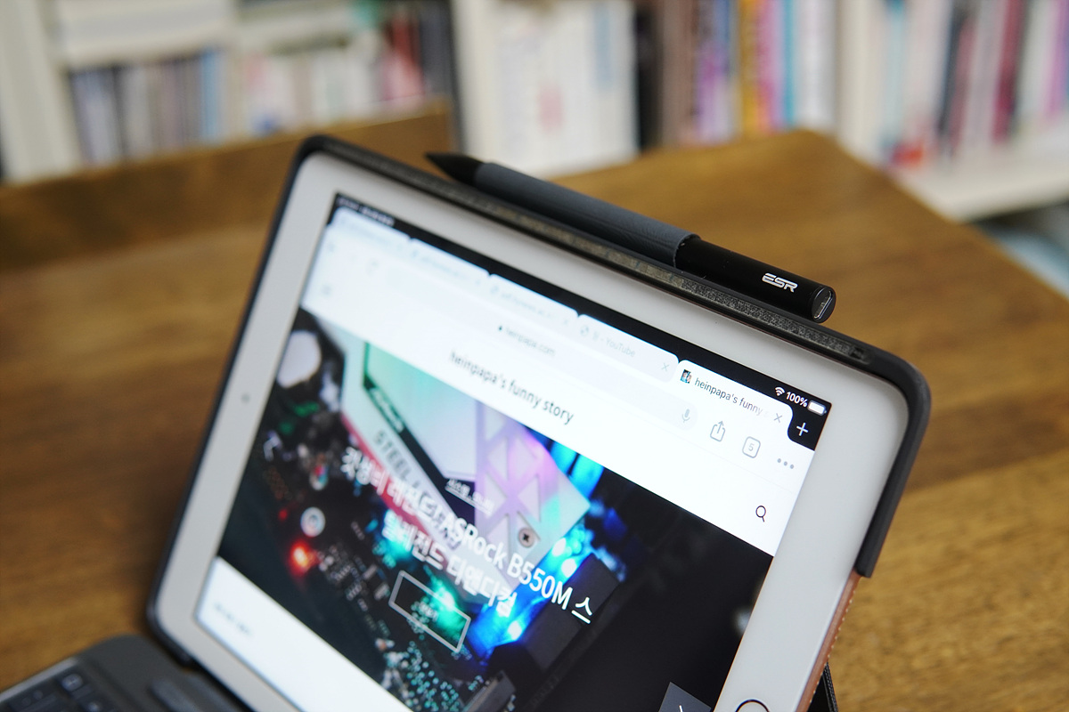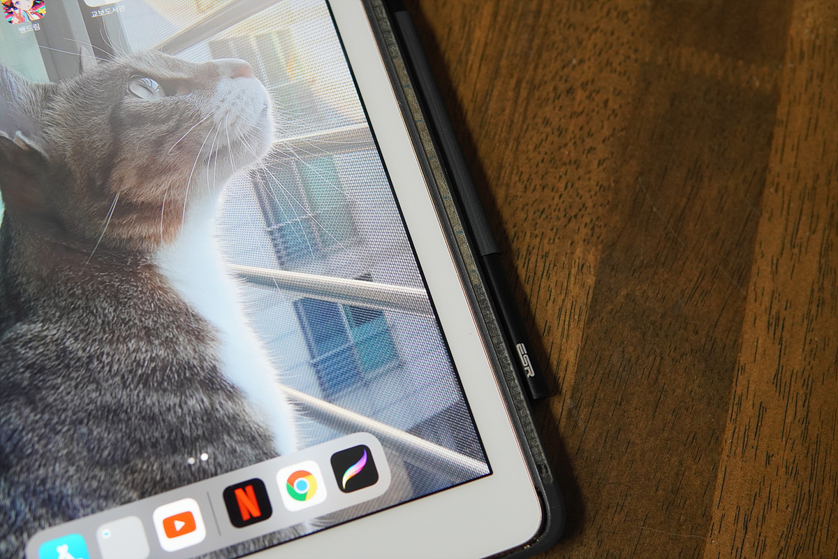 특히나 기존에 애플 펜슬이 있는 분들이 밖에서 사용하거나 서브로 사용할 때는 딱 좋은 성능과 가격이라고 생각합니다. 테스트를 해보니 가벼운 무게와 실제 책이나 노트에 쓰는 필기류(볼펜, 연필)와의 이질감이 없는 부분이 가장 마음에 들었습니다. 반대로 애플 펜슬처럼 각이 없는 원형 타입의 디자인은 아쉬움이 남았습니다. 책상 위에 잠깐 둘 때 굴러다니기도 하고 저처럼 고양이들이 있는 집에서는 더더욱 조심해야 되기 때문입니다.