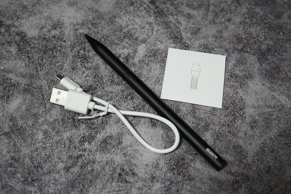 펜, 충전 케이블, 교체용 추가 펜촉으로 이루어져 있습니다.