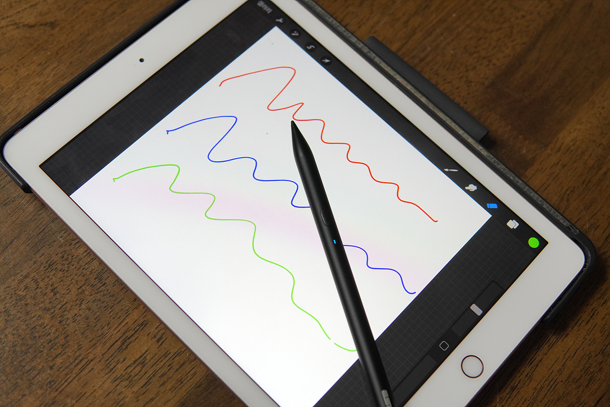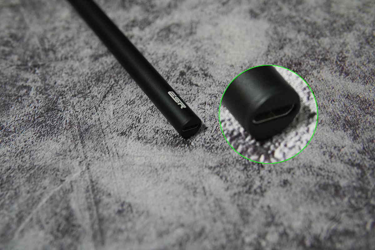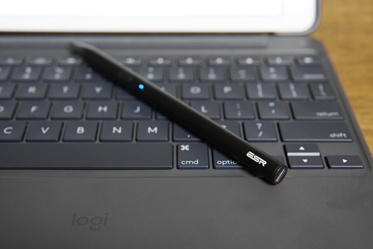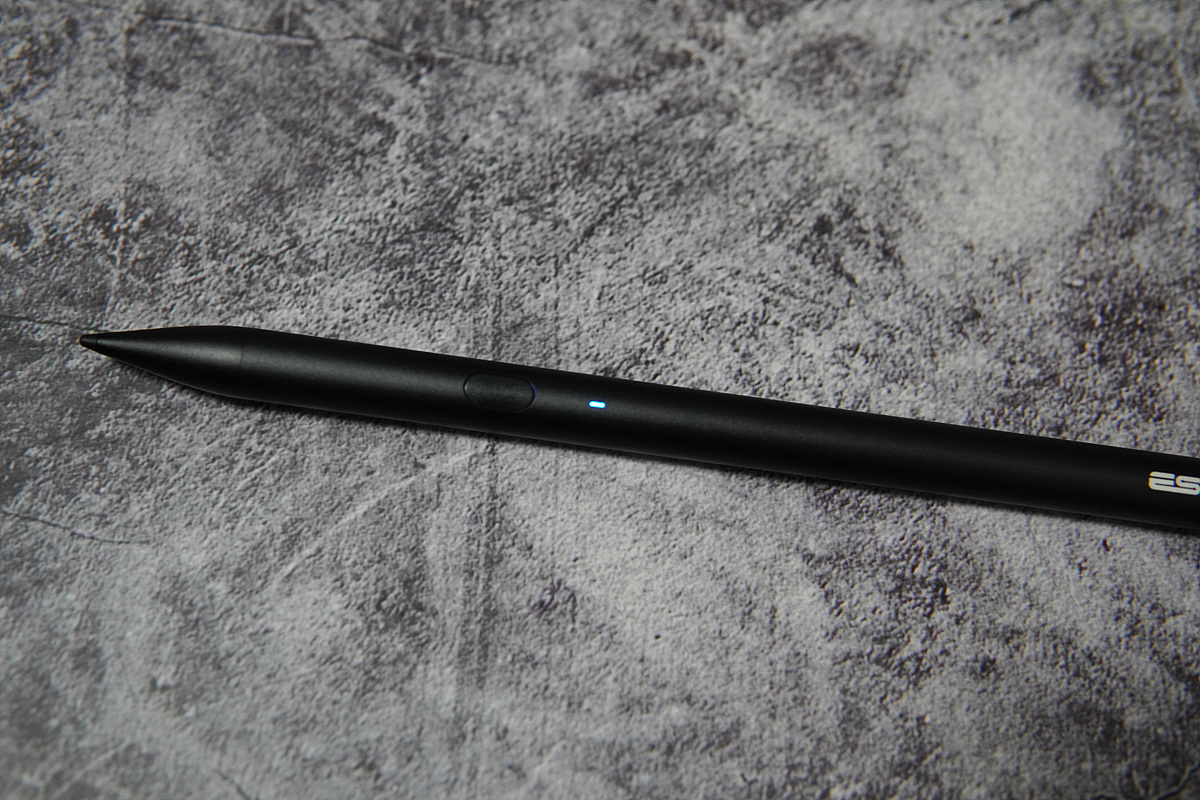 앞쪽의 버튼을 누르면 파란색 LED가 켜지면서 바로 사용할 수 있습니다. 애플 펜슬과 다르게 초기에 페어링(등록)을 해줄 필요 없이 전원 버튼을 한번 누르는 것 만으로 바로 사용할 수 있는데 이 과정이 상당히 빠르게 진행됩니다. 충전을 할 때는 LED가 빨간색으로 바뀌며 완충이 되면 파란색으로 바뀝니다.