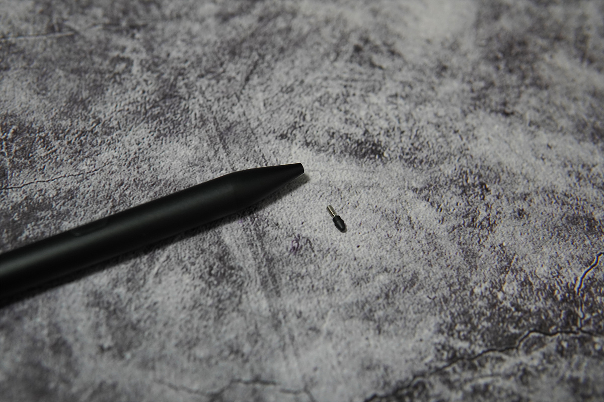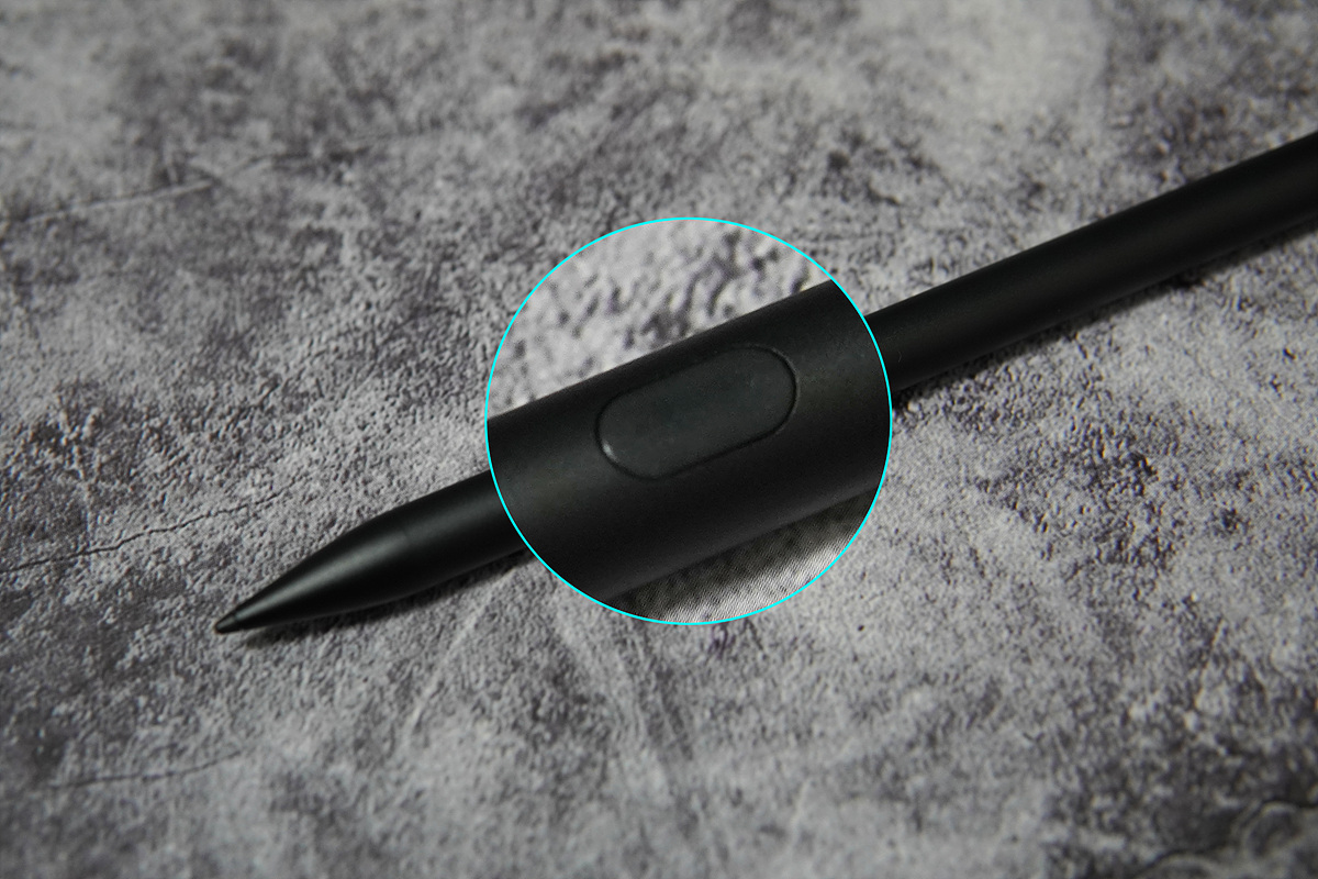 앞부분에는 전원 스위치가 있습니다. 전원 스위치는 실제 펜을 잡는 위치보다 살짝 뒤로 있지만 펜을 사용하다보면 조금은 걸리적거리더군요. 전원 on/off 모두 한번 클릭을 할 때마다 동작을 하는데 실수로 잘못 눌러서 전원을 끄는 경우가 있었습니다. 다른 제품 리뷰에서도 언급을 했지만 전원을 켤 때는 상관이 없지만 끄는 건 더블 클릭이나 1초 이상 누를 때만 동작하게 세팅을 했으면 더 좋았을 거라 생각합니다.