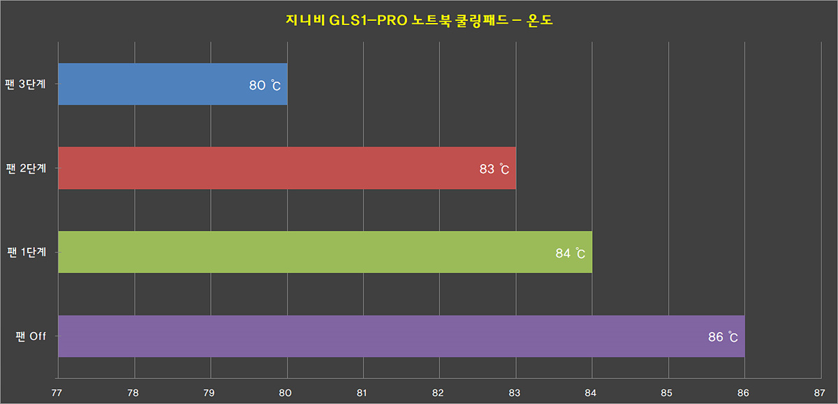 지니비 GLS1-PRO는 쿨러에서 발생되는 바람이 노트북에 특정 부분에만 집중이 되기 때문에 쿨링 성능은 그리 기대를 하지 않았었는데 제 예상보다는 괜찮은 성능을 보여주었습니다. 실제 테스트를 해보니 최대 온도뿐만 아니라 풀로드 --> 아이들 상태로 바뀌었을 때 온도가 떨어지는 시간이 더욱 확실히 체감이 되더군요.