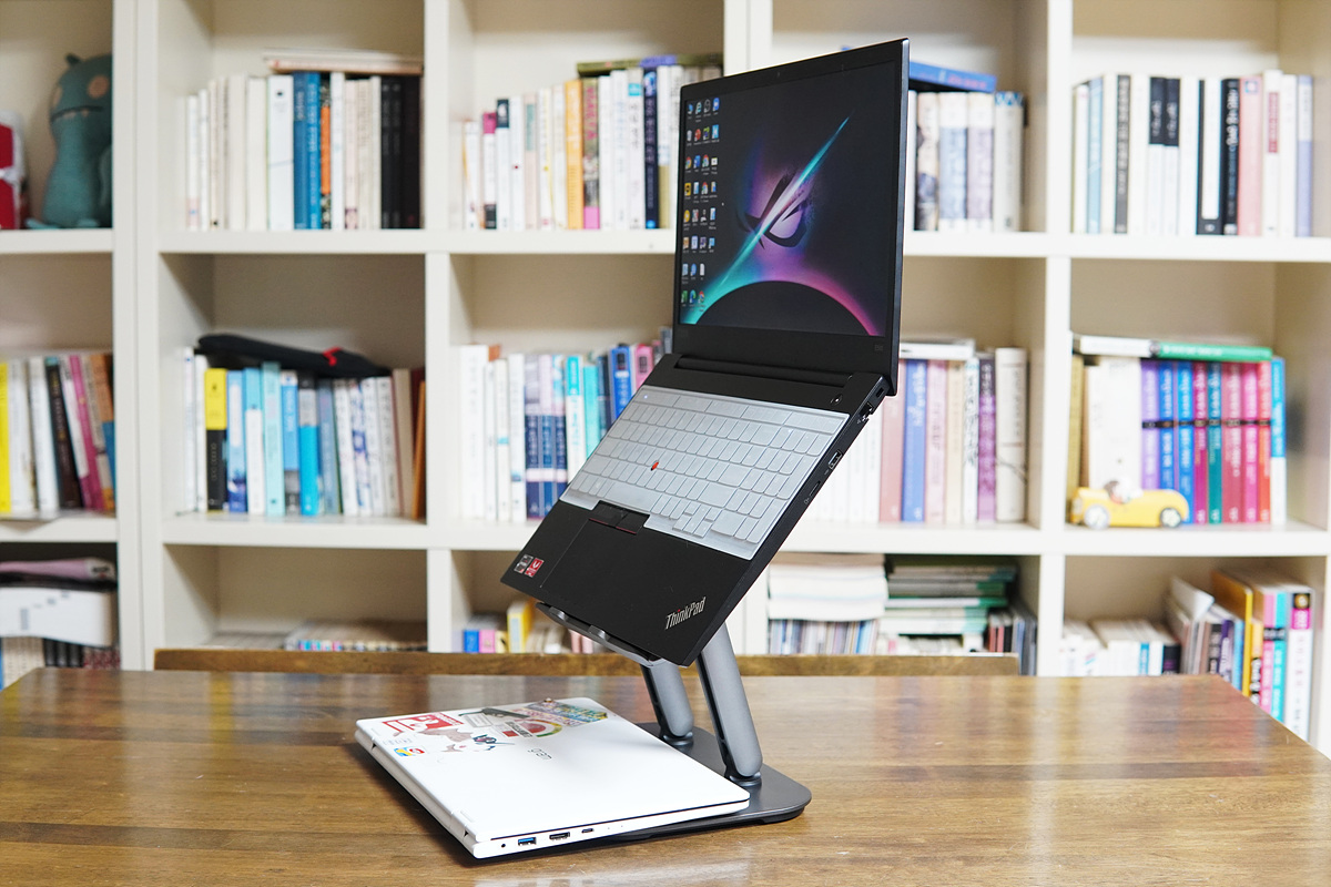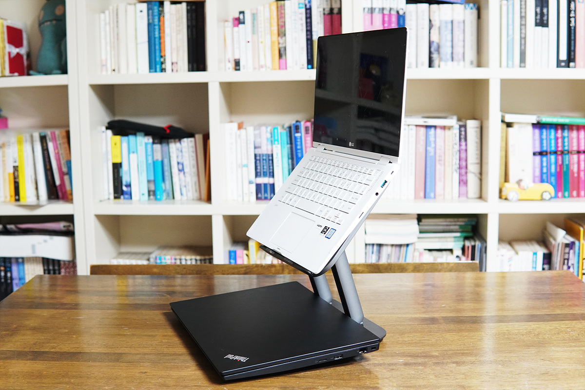 테스트에 사용된 노트북은 레노버 씽크패드 15인치 제품으로 무게는 약 1.98kg 정도 됩니다. 이 제품의 가장 장점은 노트북을 장착했을 때 확인할 수 있습니다. 2kg 정도의 노트북을 올려도 전혀 흔들리거나 덜그럭거리지 않더군요. 각도 조절이 되는 스탠드를 써보신 분들이라면 아시겠지만 노트북을 올려두고 사용하면 약간식은 유격이나 흔들림이 발생하게 되는데 GLS1-PRO 스탠드는 전혀 흔들리지 않았습니다.