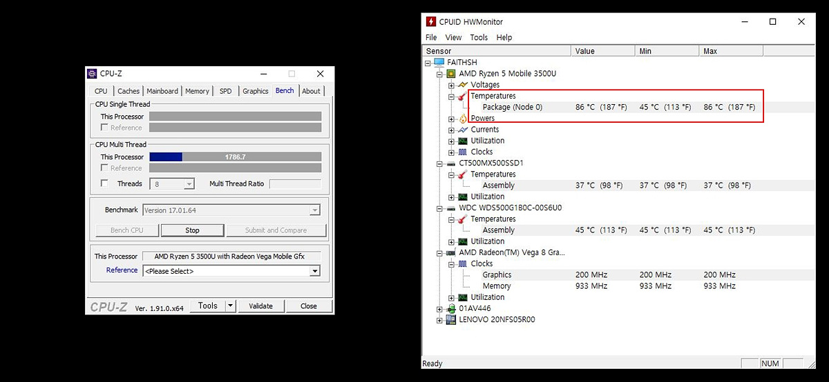 테스트에 사용된 레노버 노트북은 라이젠 5 3500U 피카소를 장착한 제품으로 고사양의 게이밍 노트북은 아닙니다. 온도 테스트는 CPU-Z로 5분 정도 풀로드를 건 상태에서 가장 높은 온도를 측정하였습니다.