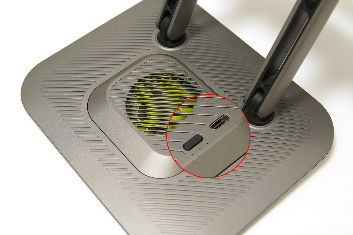 바닥 부분에는 USB Type-C 커넥터와 rpm을 조절할 수 있는 스위치가 있습니다. rpm 스위치는 한번 누를 때마다 off - 1단 - 2단 - 3단으로 동작하며 아랫부분의 LED를 통해서 현재 상태를 확인할 수 있습니다. 커넥터가 마이크로 5 핀이었다면 케이블을 연결할 때 방향 때문에 항상 확인을 해야 돼서 불편하겠지만 Type-C 커넥터는 방향에 관계없이 편리하게 장착할 수 있습니다. 스위치의 위치가 불편하지는 않았는데 아래쪽이나 측면도 좋을 거 같습니다.