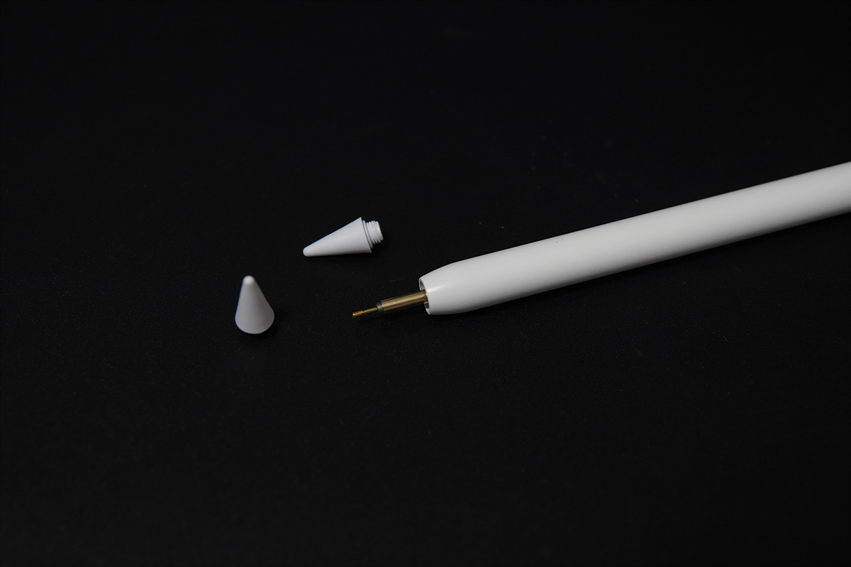 추가용 펜촉은 나사처럼 돌려서 쉽게 교체를 할 수 있습니다. 펜촉은 기존에 사용했던 다른 짭 펜슬보다 길이와 굵기 모두 더 큰 편이었습니다. 실제 애플 펜슬의 펜촉과 비슷한 크기입니다.