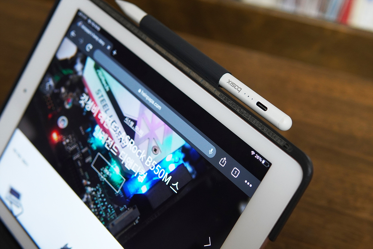 애플 펜슬에 비해 30% 정도 가벼워서 오랫동안 사용해도 부담이 없었습니다. 사용자에 따라 달라지겠지만 애플 펜슬은 오래 사용하기에는 무게가 좀 부담이 되더군요. (케이스를 씌운 상태)