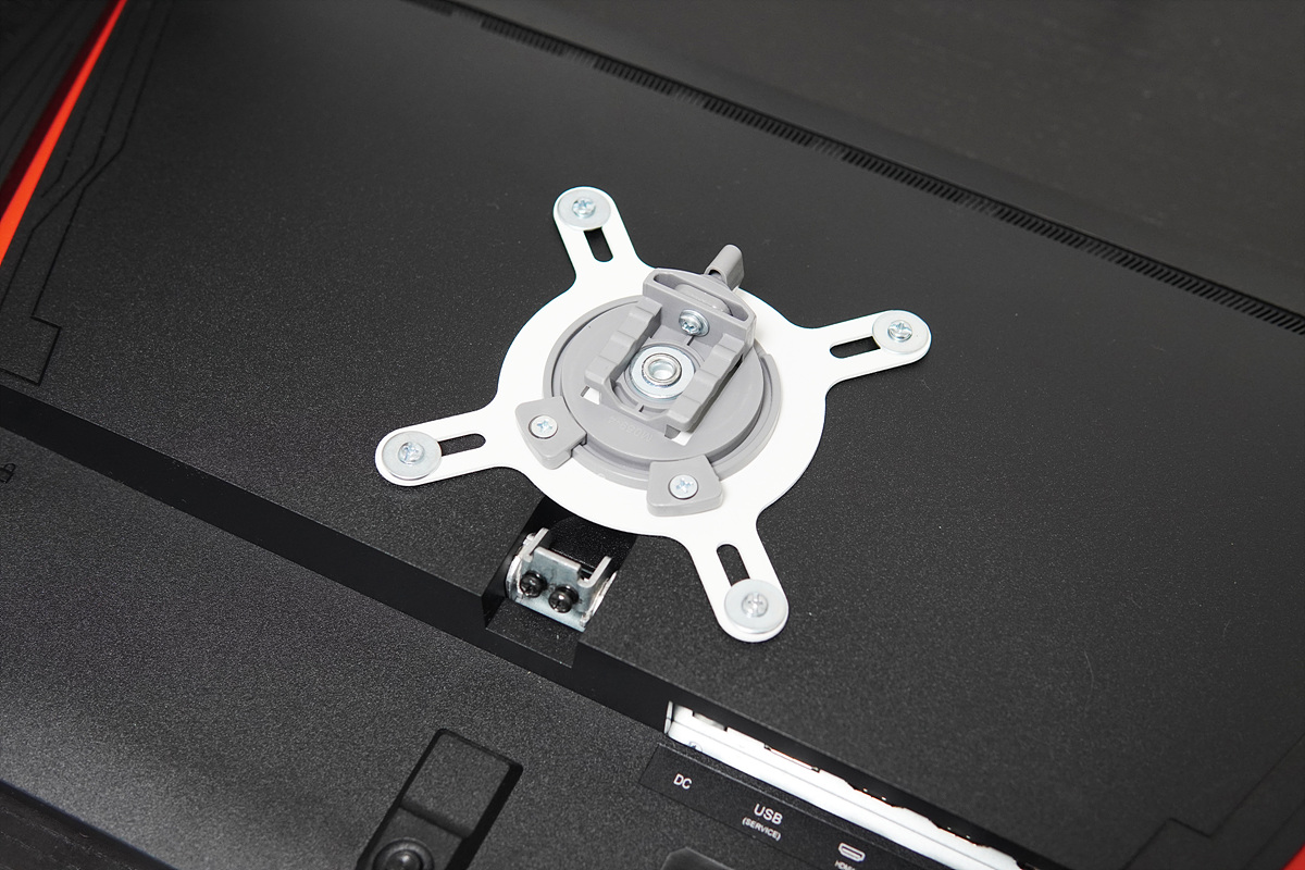 모니터암에 연결하면 설치가 완료됩니다. 앞서 언급을 했지만 이런 방법은 정말 편리합니다. 플레이트가 없다면 모니터를 암(arm)과 연결한 뒤 설치를 해야 돼서 좀 불편하더군요. 24인치 정도의 작은 모니터를 사용할 때는 크게 문제가 되지 않지만 32인치 모니터라면 크기와 무게 때문에 꽤나 진땀을 빼게 됩니다. 플레이트를 연결한 뒤에는 원터치 락(lock)으로 확실하게 고정을 할 수 있습니다. 락을 해놓지 않으면 피벗을 할 경우 모니터가 빠질 수도 있으니 꼭 확인하시기 바랍니다.