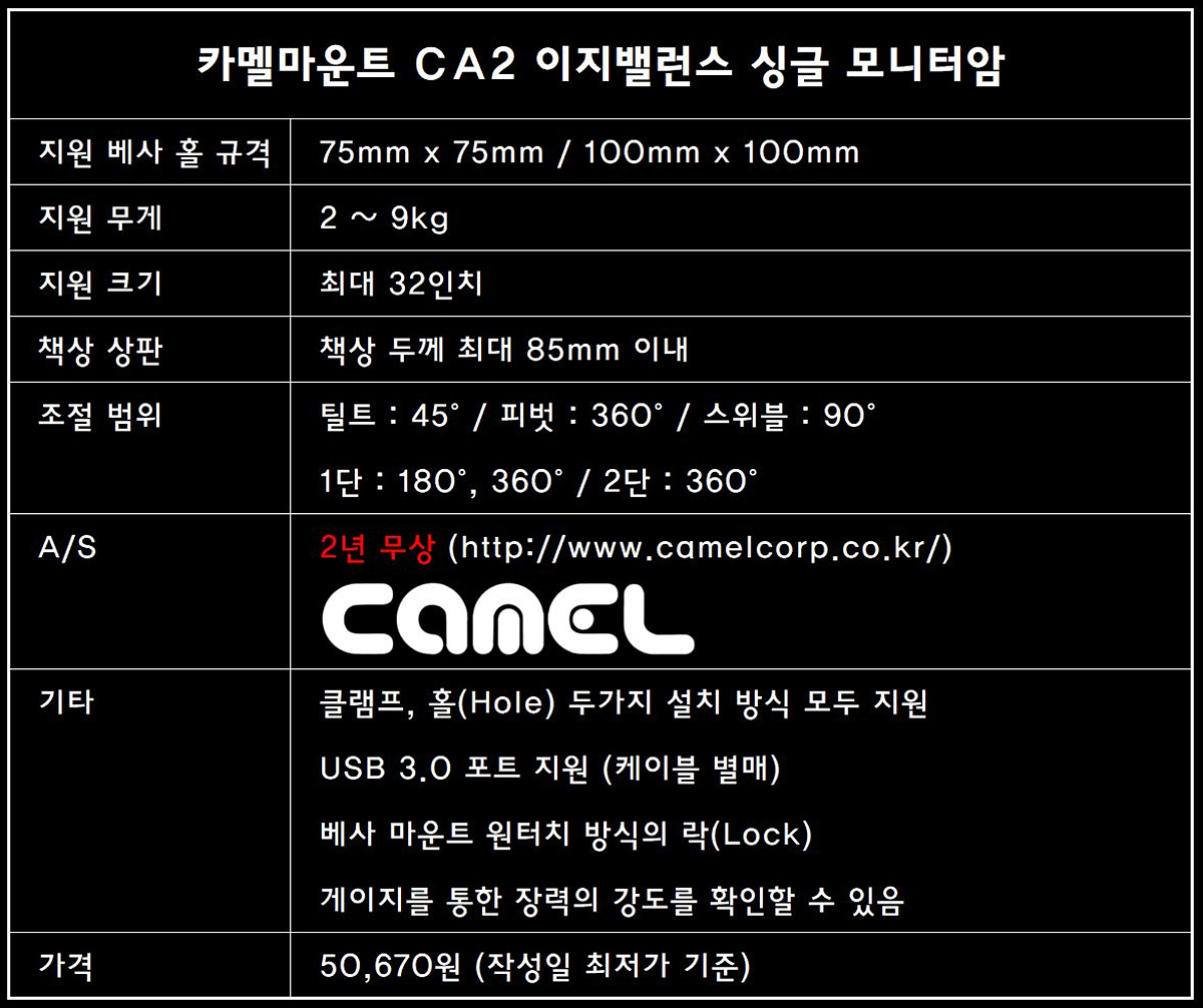 스펙을 정리하면서 눈에 뜨였던 건 클램프 or 홀(Hole) 타입 두 가지 방식 모두 사용할 수 있다는 부분과 2년의 고객지원 기간이었습니다. 모니터암의 경우 액세서리로 분류가 돼서 대부분 1년이 최대이지만 카멜마운트 제품은 1년이 추가된 2년 동안 고객지원을 받을 수 있습니다.