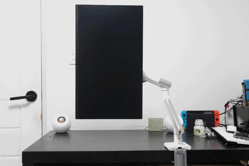 모니터암을 사용하면 뭐가 좋아요?라고 물어보면 전 이 사진으로 대답을 하고 싶습니다. 개인적으로 모니터암의 가장 큰 장점은 책상을 청소할 때라고 생각합니다. 높이 조절은 모니터 선반으로도 할 수 있고 피벗은 멀티 스탠드를 지원하는 모니터라면 자체적으로도 할 수가 있지만 이런 공간 활용은 모니터암이 아니면 절대 할 수 없는 기능이죠. 책상을 자주 청소하거나 깔끔한 환경을 원하신다면 모니터암은 선택이 아닌 필수입니다. 특히나 대형 모니터를 사용하는 분들이라면 모니터암은 더더욱 필수입니다.