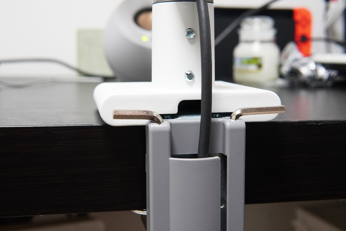 클램프는 책상의 두께에 따라서 나사의 위치를(빨간색 원) 조절해서 고정할 수 있습니다. 일반적인 책상이라면 사진 위치처럼 윗부분에 고정하고 상판 두께가 55mm 이상이라면 아래쪽으로 이동해서 고정할 수 있습니다. 책상 상판은 최대 85mm 두께까지 사용할 수 있습니다. (거의 모든 책상에서 사용할 수 있는 두께입니다.)