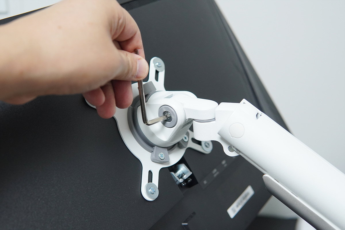 모니터가 인사하듯이 앞으로 숙여지게 되면 사진처럼 육각 나사를 시계방향으로 돌려주세요. 너무 강하게 조이면 모니터의 틸트(tilt) 각도를 조절할 수 없으니 약간 뻑뻑하게 움직 일정도로면 조절하시기 바랍니다.