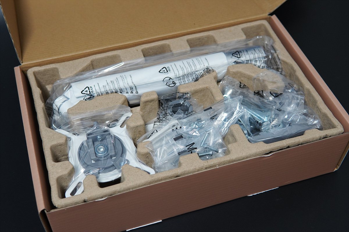 책상에 고정하는 클램프, 두 개의 암(arm)과 여러 가지 부속품들은 안전하게 포장이 되어있습니다.
