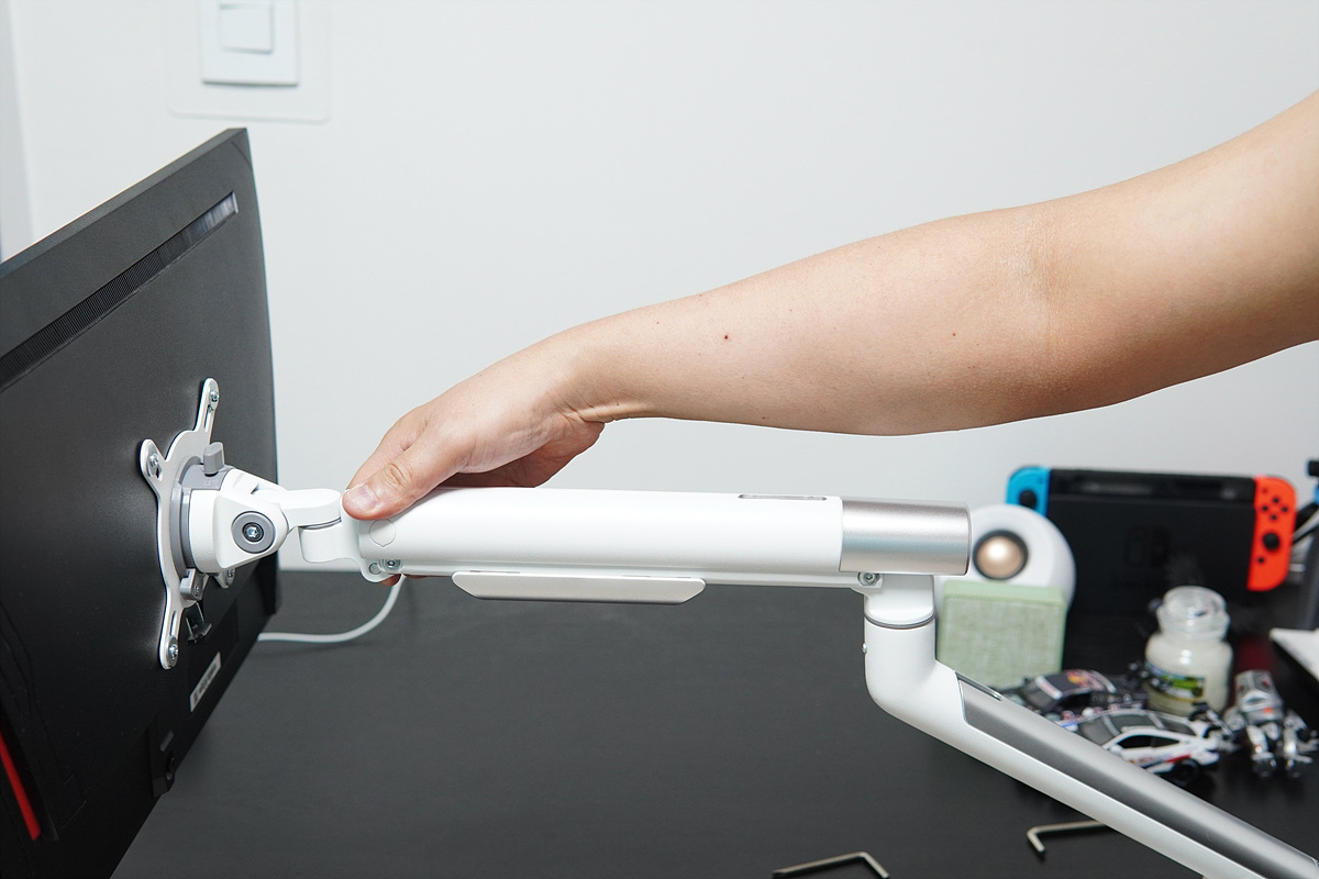 모니터 암의 적당한 장력은 사진처럼 모니터암을 가로로 놓은 뒤 놓았을 때 그대로 유지가 되어야 합니다. 이때 모니터가 아래로 내려가면 시계 방향으로 돌려서 장력을 강하게 하시고 반대로 모니터가 위로 올라간다면 반시계 방향으로 장력을 좀 더 약하게 조절해줘야 합니다. 작고 가벼운 모니터라면 장력을 좀 많이 풀어주어야 합니다. 저는 24인치 모니터를 사용했는데 90% 정도로 장력을 풀어주었습니다.
