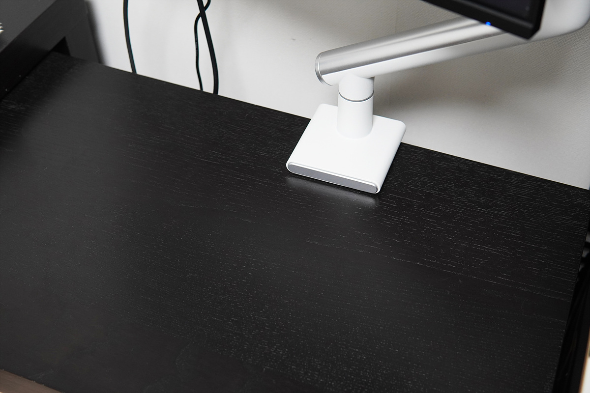 모니터를 올려두면 키보드와 마우스를 놓을 공간이 부족했지만 모니터암이 있다면 이런 제약이 사라지게 됩니다. 사실 이 사진 한 장으로도 모니터암의 필요성이 바로 설명이 됩니다.