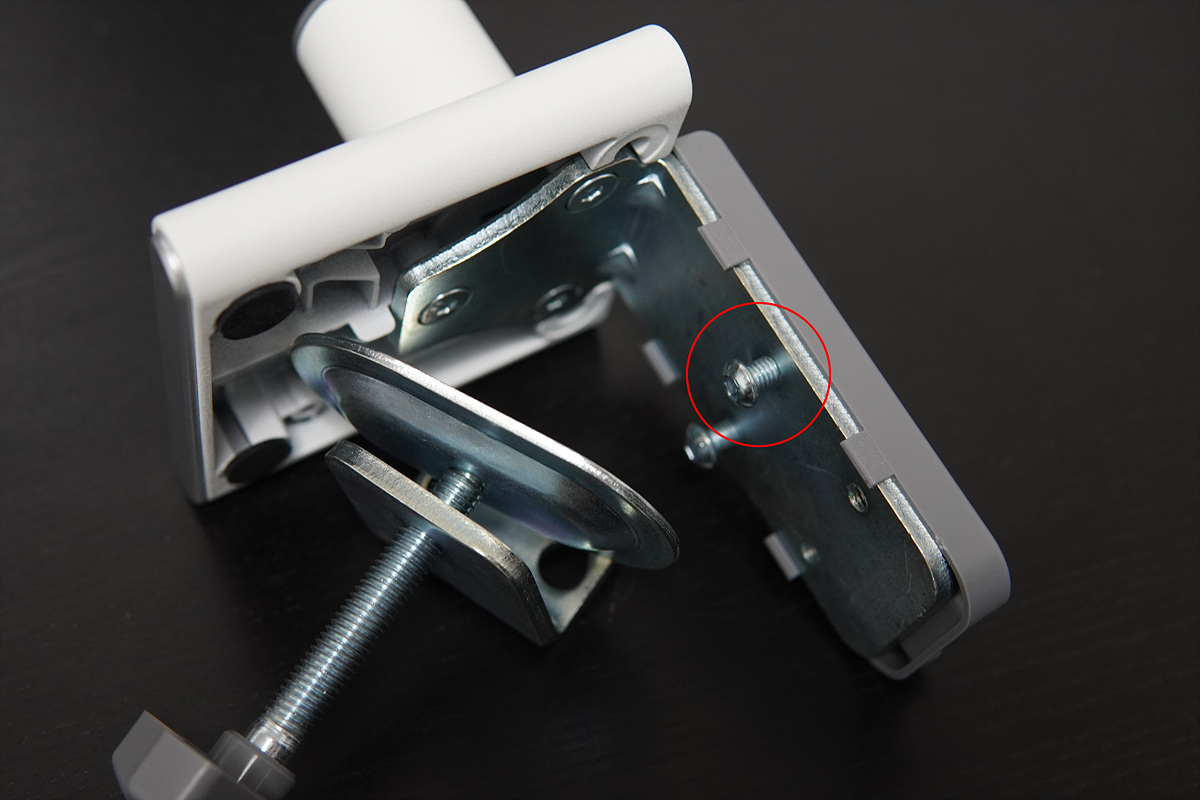 클램프는 책상의 두께에 따라서 나사의 위치를(빨간색 원) 조절해서 고정할 수 있습니다. 일반적인 책상이라면 사진 위치처럼 윗부분에 고정하고 상판 두께가 55mm 이상이라면 아래쪽으로 이동해서 고정할 수 있습니다. 책상 상판은 최대 85mm 두께까지 사용할 수 있습니다. (거의 모든 책상에서 사용할 수 있는 두께입니다.)