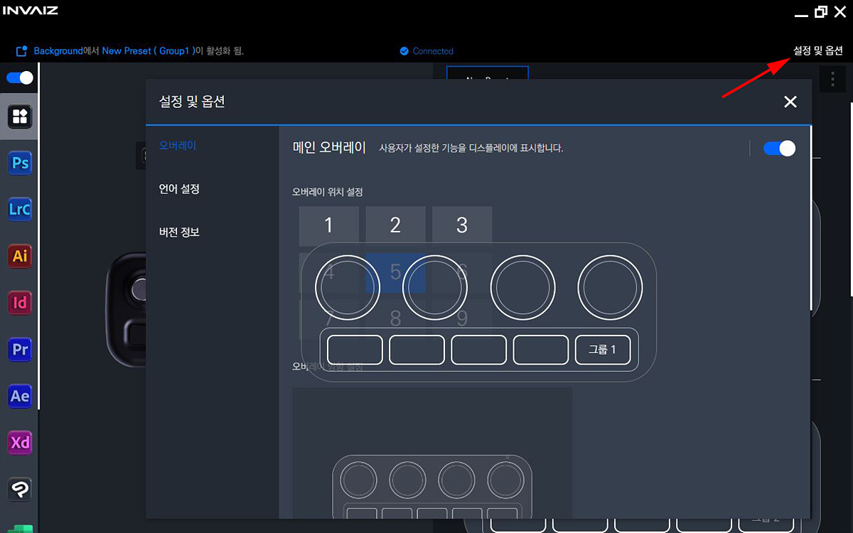 Grid10 컨트롤러의 가장 큰 특징 중 하나가 바로 이 오버레이 화면입니다. 내가 등록한 버튼의 기능이 화면에 직접 표시가 되어서 익숙하지 않은 상태에서도 편리하게 사용할 수 있습니다. 이 오버레이 화면은 9개의 위치로 변경이 가능하며 가로 세로 방향의 전환도 가능합니다. 컨트롤러를 가로가 아닌 세로로 놓고 사용한다고 해도 화면에서 이 방향을 변경할수도 있고 위치 역시 조절할 수 있습니다.