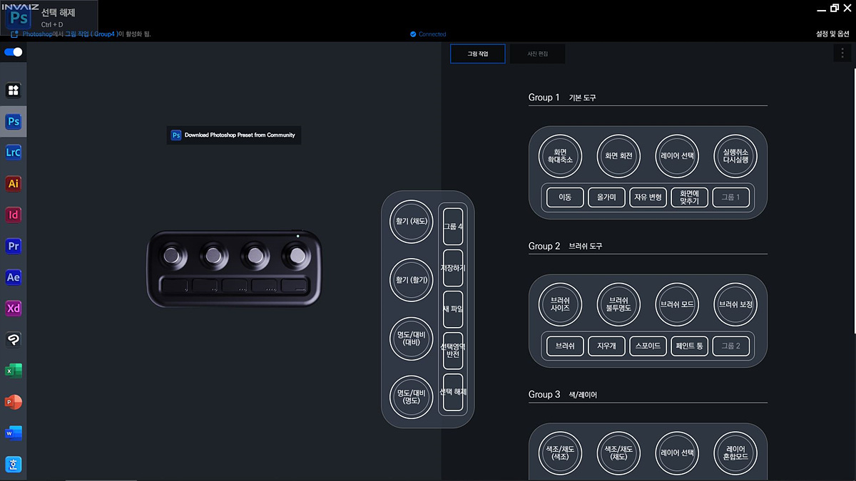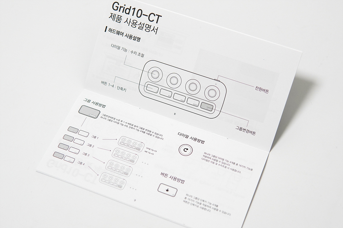 이번 시간에 소개하는 Grid10 컨트롤러는 이런 단축키들을 키보드로 입력하는 게 아닌 별도의 버튼이나 다이얼로 더욱 직관적이고 편리하게 사용할 수 있는 입력기기입니다. 예를 들면 엑셀(Excel)이나 포토샵에서 화면을 확대할 때 Ctrl, Alt 키를 누른 채 휠을 돌려야 하지만 Grid10에서는 다이얼을 돌리는 것만으로 이런 작업을 쉽고 빠르게 할 수 있습니다. 프리미어에서는 다이얼을 통해서 프레임 단위의 이동도 쉽고 할 수 있습니다. 이런 컨트롤러는 기존에도 몇 가지 제품들이 있었지만 기능을 실행하는 다이얼이나 버튼의 개수가 적어서 기능이 다소 제한적이었습니다. 하지만 인바이즈 Grid10은 4개의 다이얼과 4개의 버튼 그리고 모드를 변경할 수 있는 버튼으로 사용자가 원하는 조합으로 다양한 명령이나 단축키를 설정할 수 있습니다.