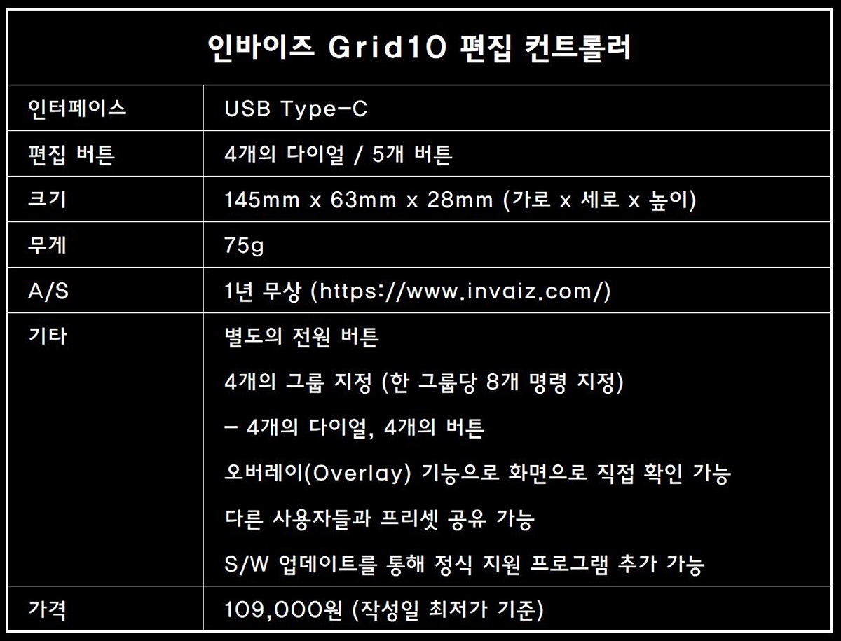 하루 종일 PC 앞에서 작업을 하는 사용자들에게 단축키는 필수적인 기술 중 하나입니다. 마우스로 서너 번 클릭해서 사용하는 기능을 단축키 한 번으로 사용할 수 있으니 편리성뿐 아니라 작업 시간까지 줄어들게 됩니다. 이런 단축키는 문서 편집에서도 편하지만 사진이나 동영상 위주로 작업을 하는 크리에이터들에게는 더더욱 필요한 기술입니다. 이번 시간에 소개한 인바이즈 Grid10 컨트롤러는 별도의 다이얼(노브)과 버튼으로 이런 단축키나 명령을 한 번에 실행할 수 있는 입력기기로 기존 키보드로 실행하는 단축키보다 더욱 쉽고 빠르게 작업을 할 수 있습니다.
