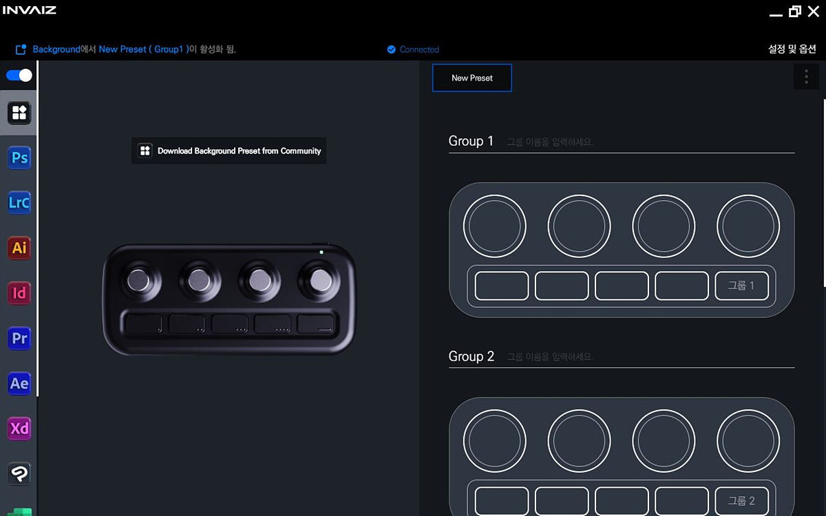 인바이즈 스튜디오의 초기화면입니다. 왼쪽에는 정식으로 등록된 프로그램들의 목록이 있어서 쉽게 확인할 수 있습니다. 윈도우의 기능이나 정식으로 등록되지 않은 프로그램은 Background 항목에서 프리셋을 추가해서 사용을 할 수 있습니다. 인바이즈에 문의를 해보니 소프트웨어 업데이트를 통해서 AutoCAD는 곧 정식으로 등록될 예정이라고 합니다. 나중에는 왼쪽 탭의 프로그램 등록도 사용자가 직접 할 수 있는 방법도 검토 중이라고 합니다.
