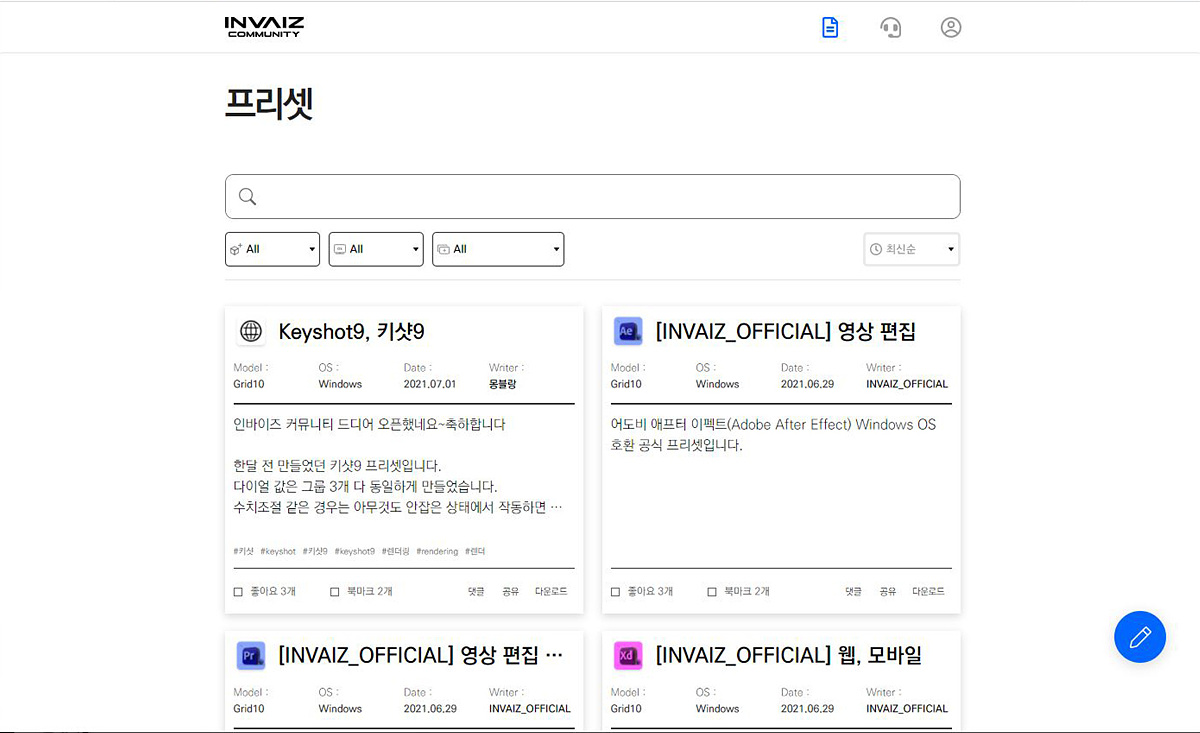 인바이즈 스튜디오의 또 다른 특징이자 장점은 커뮤니티를 통해 사용자들끼리 프리셋을 교환할 수 있다는 점이죠. 이제 입문하는 사용자들은 어떤 기능을 써야 할지 몰라서 헤맬 수도 있지만 프리셋을 공유하면 고수들의 노하우를 쉽고 빠르게 배울 수 있습니다. Grid10 사용자들이 많아질수로 좋은 정보들은 더더욱 많아지겠죠.