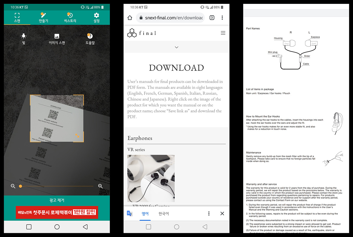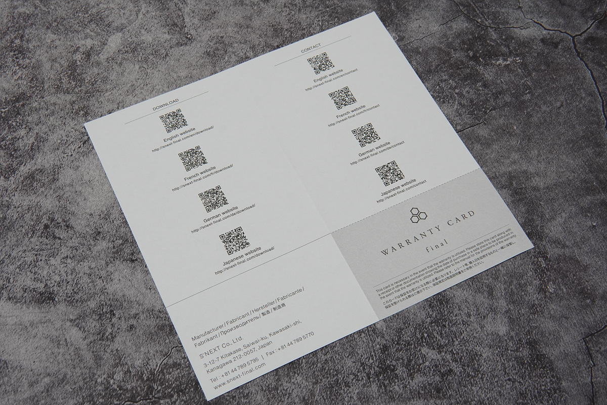 커다란 종이는 워런티 카드와 제품의 사용 설명서를 다운로드할 수 있는 QR 코드입니다. 유선 이어폰은 TWS 제품들과는 다르게 다양한 기능이나 조작방법이 거의 없는 편이라 간단하게 설명이 되어있어도 괜찮지만 파이널 E3000은 제품에 대한 설명은 없고 다운로드할 수 있는 QR에 대한 설명만 있습니다.