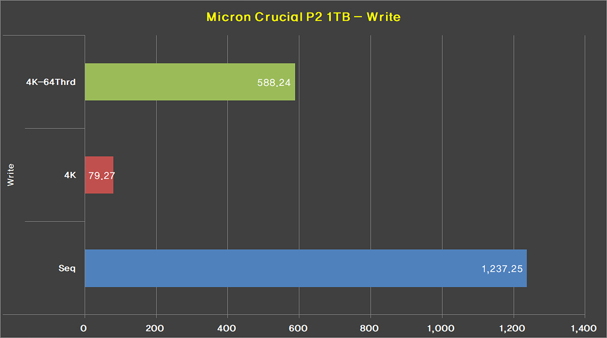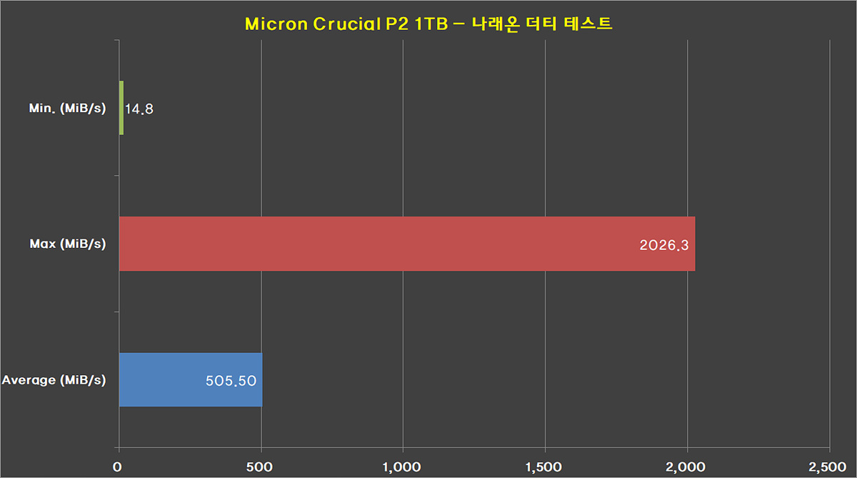나래온 더티 테스트를 4번 측정한 결괏값의 평균입니다. 나래 테스트는 SSD의 0~100%까지 모든 구간을 테스트하는 벤치마크입니다. 가끔씩 어떤 리뷰에서는 나래온 테스트에서 캐시 메모리 테스트 영역만을 보여주거나 50%도 채우지 않고 중단하고 그걸 캡처해서 보여주더군요. 이런 테스트는 아무런 의미가 없으므로 해당 벤치는 그냥 거르시기 바랍니다. 벤치 결과가 안 좋으니 그걸 보여주기 싫어서 숨기려고 꼼수를 쓰거나 벤치가 귀찮다는 뜻으로 해석할 수밖에 없습니다.