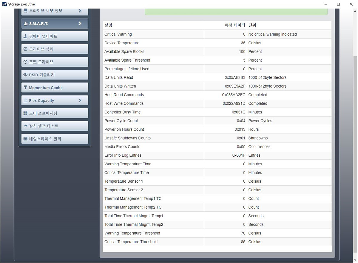 설치 후에는 왼쪽에 12개의 탭으로 SSD의 성능이나 상태 확인과 펌웨어 업데이트를 진행할 수 있습니다. 실제 사용은 드라이브 세부 정보 / S.M.A.R.T / 펌웨어 업데이트 / 장치 셀프 테스트 이 4가지를 가장 많이 사용하게 됩니다.