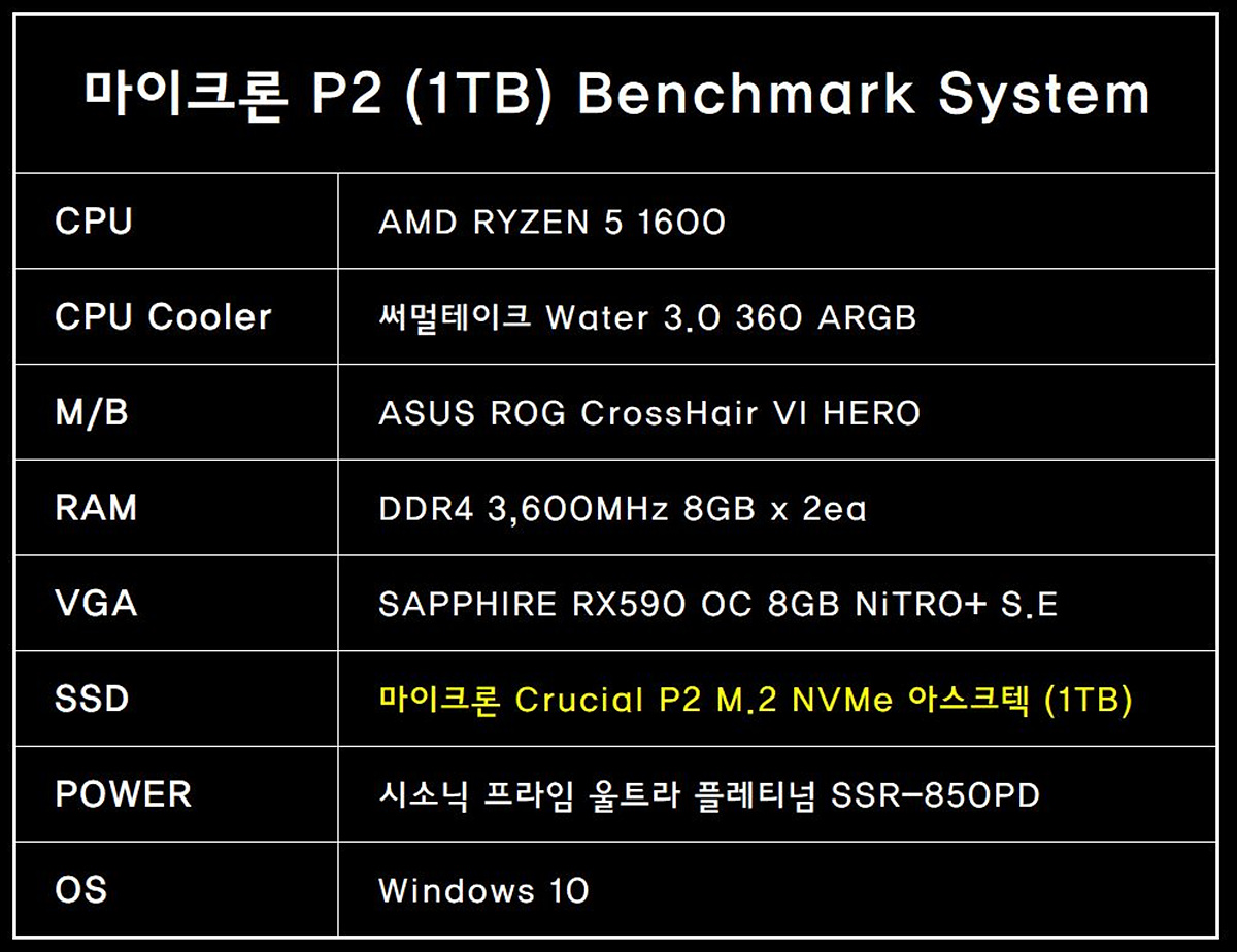 마이크론 P2 SSD를 테스트할 시스템 사양과 벤치마크 S/W는 아래의 같습니다.