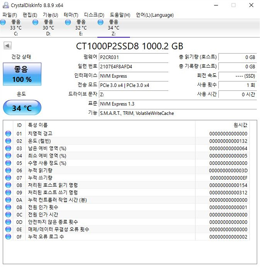 CPU-Z / Crystal Disk Info를 통해 제품의 상태를 간단하게 확인할 수 있습니다.