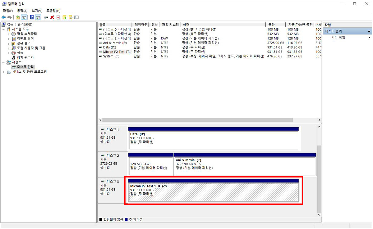 장착 후 장치 관리자에서 SSD를 확인할 수 있습니다.