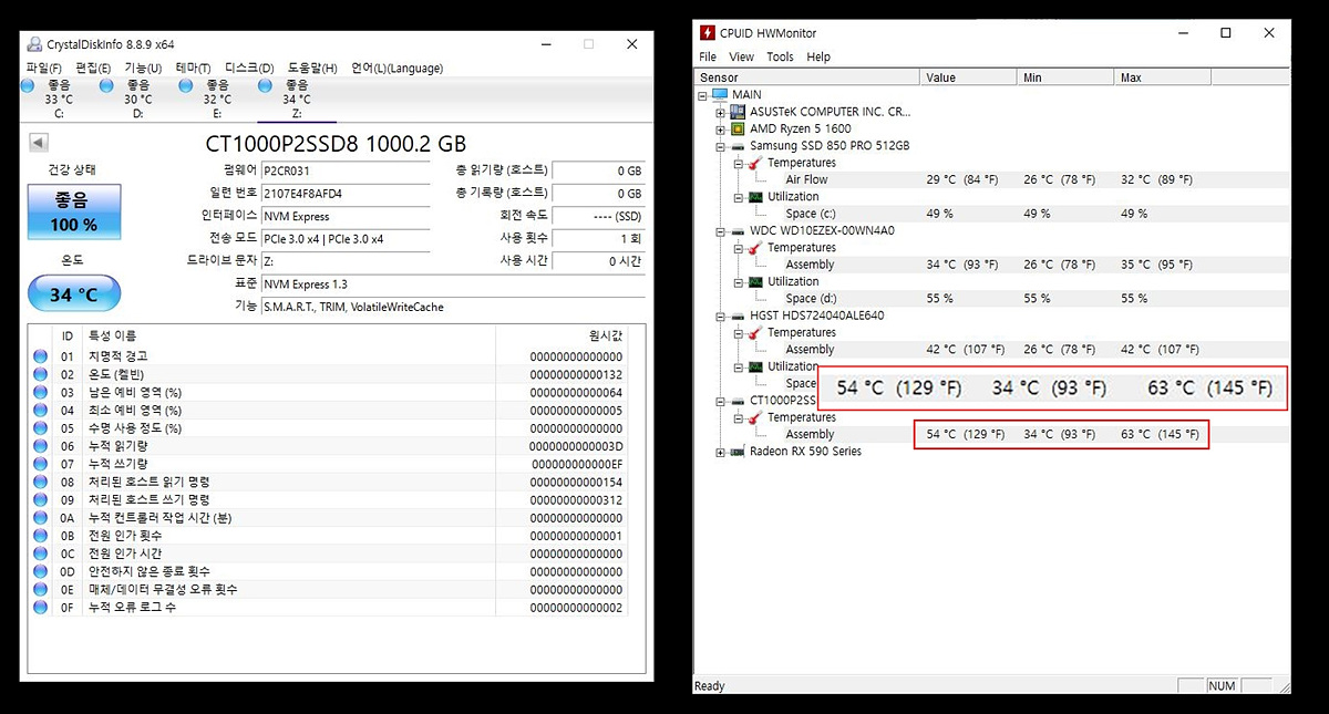 CPU-Z / Crystal Disk Info를 통해 제품의 상태를 간단하게 확인할 수 있습니다.