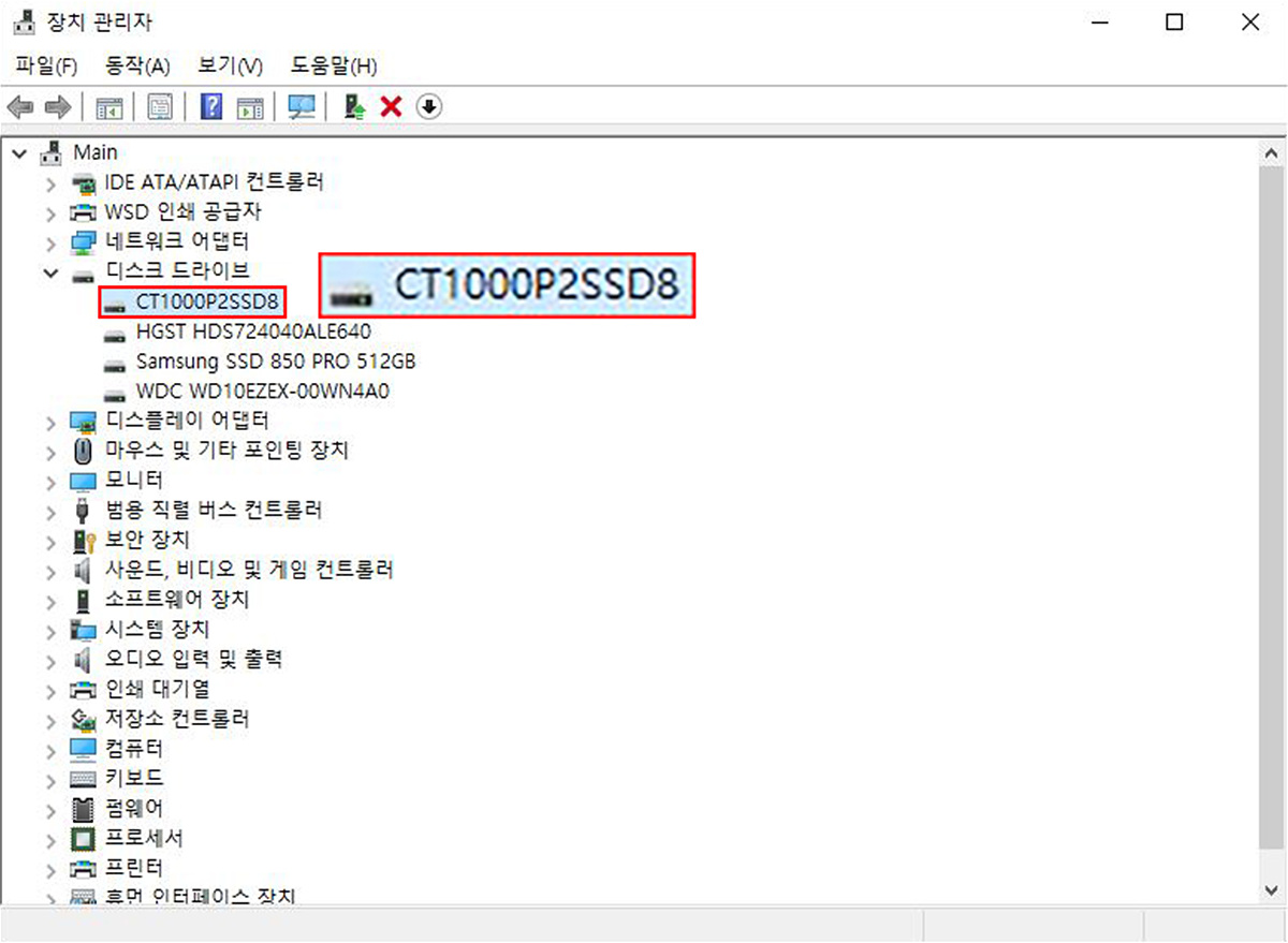 장착 후 장치 관리자에서 SSD를 확인할 수 있습니다.