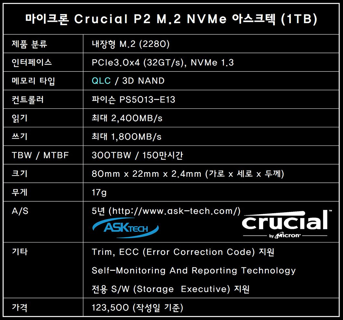 이런 이유 때문에 제목처럼 QLC SSD는 아직까지는 좀 애매한 위치라고 판단이 되었습니다. 마이크론 P2 SSD가 삼성이나 다른 QLC SSD에 비해 좀 더 저렴한 편이지만 소비자 입장에서는 가격적인 부분이 매력적으로 보이지 않았습니다. 제품의 장/단점을 끝으로 마무리를 하겠습니다. 오타나 수정 그리고 추가되어야 할 부분이 있다면 댓글로 알려주세요. 확인 후 수정하도록 하겠습니다.