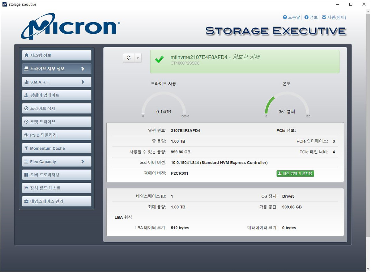 설치 후에는 왼쪽에 12개의 탭으로 SSD의 성능이나 상태 확인과 펌웨어 업데이트를 진행할 수 있습니다. 실제 사용은 드라이브 세부 정보 / S.M.A.R.T / 펌웨어 업데이트 / 장치 셀프 테스트 이 4가지를 가장 많이 사용하게 됩니다.