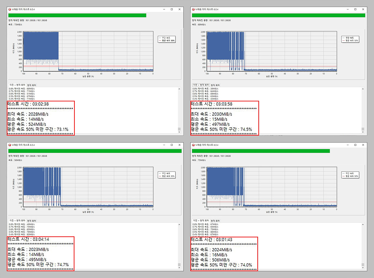0~100%까지 SSD의 모든 구간을 쓰는 나래 테스트에서는 QLC, 디램리스의 한계를 확실히 보여주었습니다. 그래도 지난 P1에 비한다면 많이 좋아진 모습이었습니다.