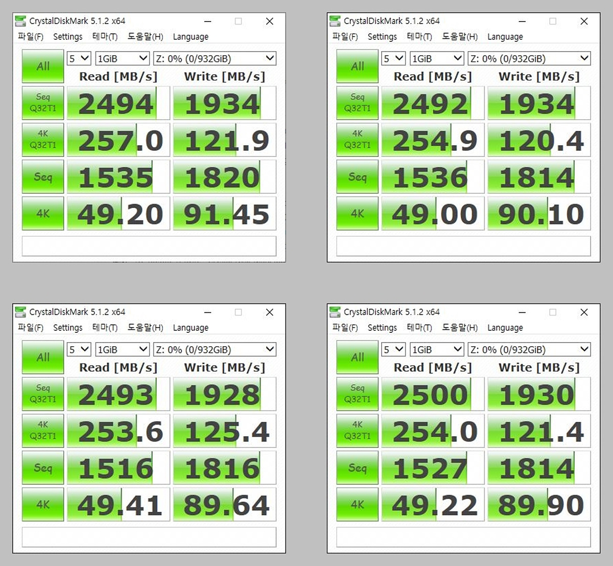 Crystal Disk Mark를 4번 측정한 결괏값의 평균입니다. 스펙 속도보다 조금 웃도는 성능을 보여주었습니다.