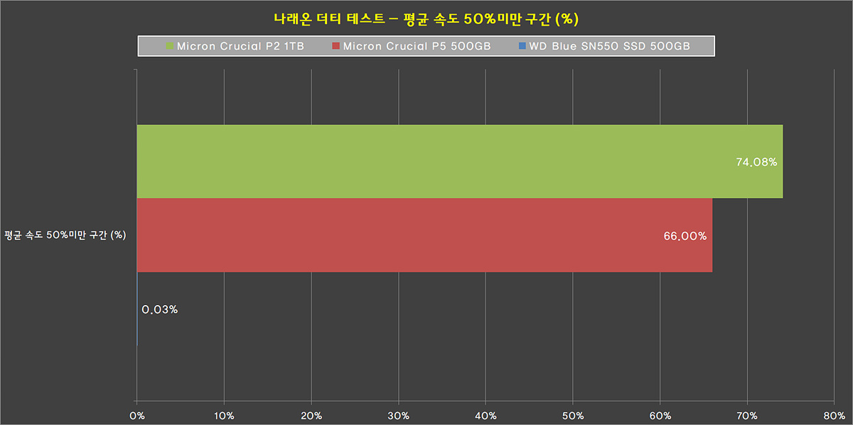 개인적으로는 SSD 벤치 중에서 나래 테스트를 가장 신뢰하고 중요하게 생각합니다. 물론 실 사용 환경에서 나래 테스트처럼 SSD의 성능을 0~100%까지 모두 사용할 일은 없겠지만 반대로 SSD의 성능을 모두 확인해볼 수 있다고 생각을 합니다. 이 테스트에서는 50% 구간뿐만 아니라 전체적인 테스트 시간이 상당히 중요합니다. P2의 용량이 1TB로 높은 편이긴 하지만 한번 테스트에 3시간으로 상당히 오래 걸렸습니다. 그래도 지난번 테스트했던 P1 보다는 속도가 많이 향상이 되었습니다.