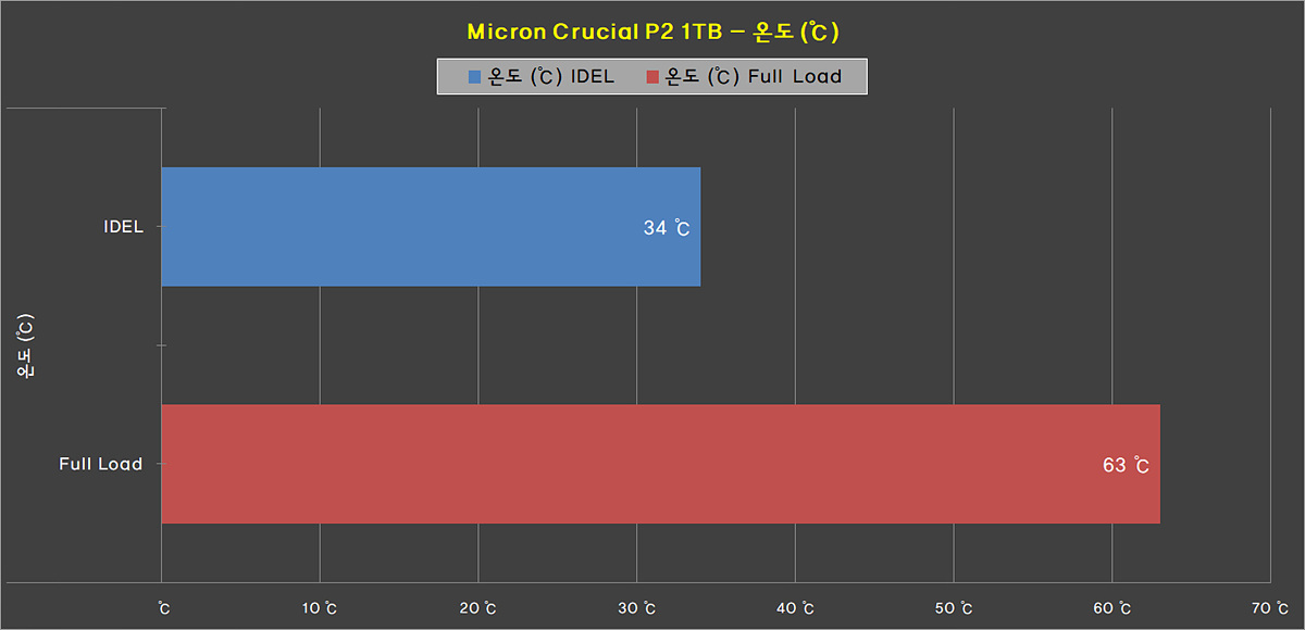 SSD의 전체적인 성능이 조금 떨어지는 편이어서 그런지 온도에서는 확실히 다른 제품들보다 좋은 편이었습니다. 별도의 방열판을 장착하지 않았음에도 최고 온도가 63도로 상당히 좋은 결과를 보여주었습니다.