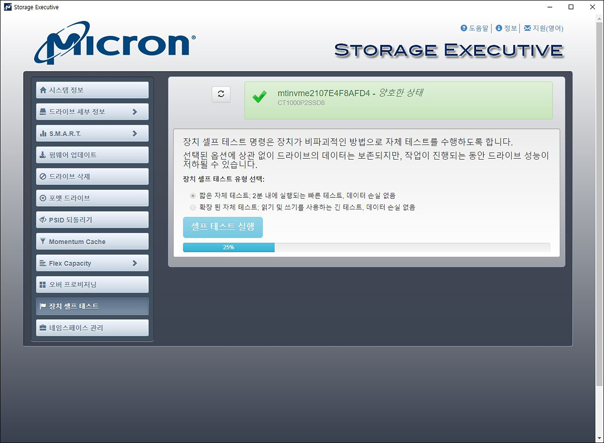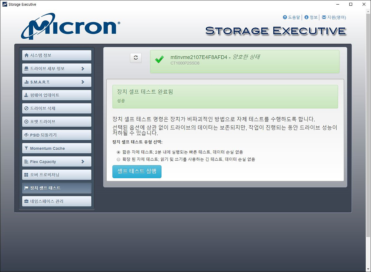 셀프 테스트를 통해서 SSD의 상태를 확인할 수 있습니다. 가끔씩 확인해보시기 바랍니다.