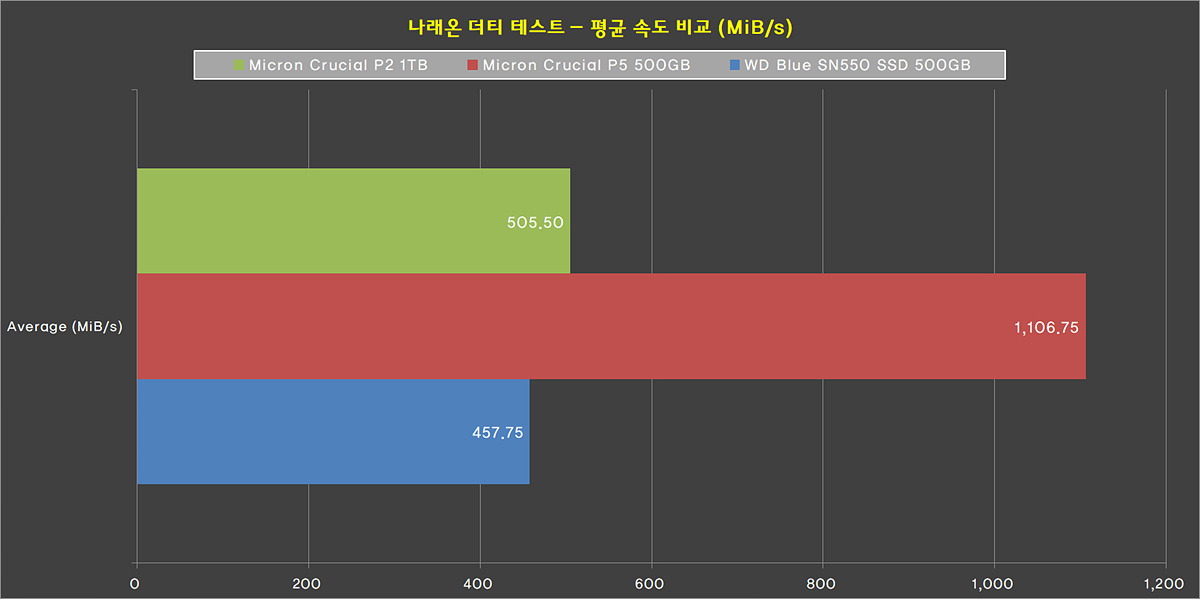 나래온 더티 테스트를 4번 측정한 결괏값의 평균입니다. 나래 테스트는 SSD의 0~100%까지 모든 구간을 테스트하는 벤치마크입니다. 가끔씩 어떤 리뷰에서는 나래온 테스트에서 캐시 메모리 테스트 영역만을 보여주거나 50%도 채우지 않고 중단하고 그걸 캡처해서 보여주더군요. 이런 테스트는 아무런 의미가 없으므로 해당 벤치는 그냥 거르시기 바랍니다. 벤치 결과가 안 좋으니 그걸 보여주기 싫어서 숨기려고 꼼수를 쓰거나 벤치가 귀찮다는 뜻으로 해석할 수밖에 없습니다.