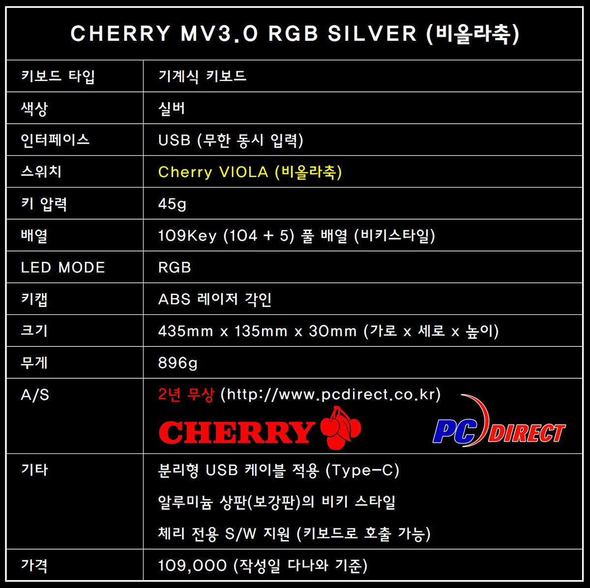 제품의 스펙을 간단하게 정리해보았습니다. 체리 비올라 스위치가 사용이 되었다는 점이 가장 큰 특징이겠지만 추가로 그동안 체리의 상징과도 같은 무보강 방식이 아닌 알루미늄 상판(보강판)을 사용했다는 점 역시 상당히 눈에 띄었습니다. 기존 체리 제품에서는 MX Board 1.0에서만 메탈 재질의 보강판을 사용되었습니다.