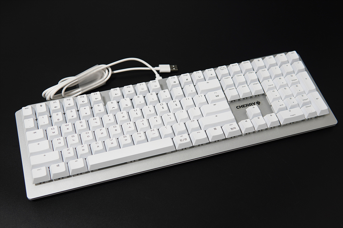 알루미늄 상판의 비키 스타일이라서 기존에 보던 체리 키보드와는 많이 다른 모습이었습니다. 실버의 알루미늄 상판과 흰색의 키캡이 상당히 깔끔한 느낌이라 다지인은 마음에 들었습니다. 키보드는 무조건 블랙이라고 생각했는데 요즘은 화이트 계열이 더 끌리더군요.