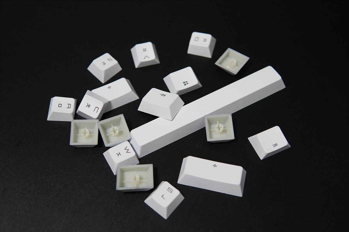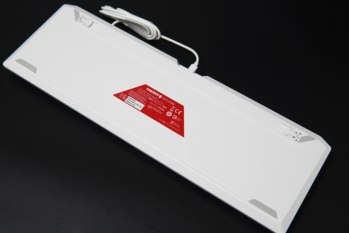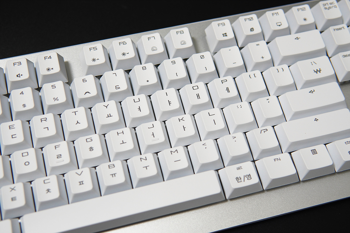 키캡은 ABS 재질로 UV 코팅을 통해 한/영 모두 레이저 각인으로 글자와 LED를 투과하고 있습니다. 기존 체리 키보드에서 "RGB = ABS", "nonRGB = PBT"의 방식이었는데 MV3.0 역시 같은 공식이 적용되었습니다. PBT까지는 아니더라도 레이저 각인이 아닌 이중사출 방식을 사용했으면 더 좋았을 거라 생각합니다. G80-3000 TKL 키보드처럼 PBT 재질에 이중사출이라면 더욱 좋겠죠.