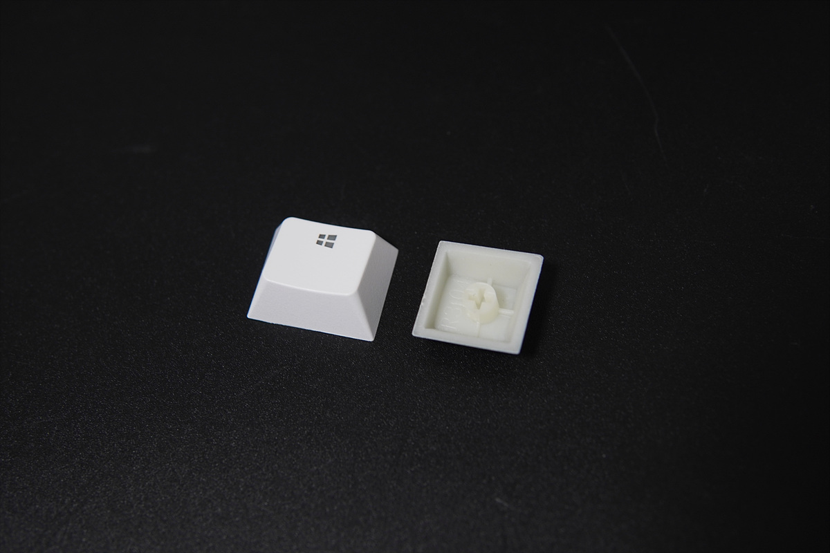 하우징뿐 아니라 키캡과 결합되는 십자(+) 돌기 부분까지도 모두 투명하게 되어있습니다. 비올라 스위치는 키보드 하우징처럼 위쪽 두 곳이 모따기(chamfer)가 되어있어서 사각이 아는 육각형의 모양을 하고 있습니다. 스위치의 장착 역시 기존 정방향 / 역방향의 개념이 아닌 반시계 방향으로 90도 회전이 되어있습니다. 스위치를 뽑을 수 있는 도구가 포함되어있으면 분리해서 좀 더 자세하게 살펴볼 수 있었을 텐데 그렇지 못해서 많이 아쉬웠습니다.