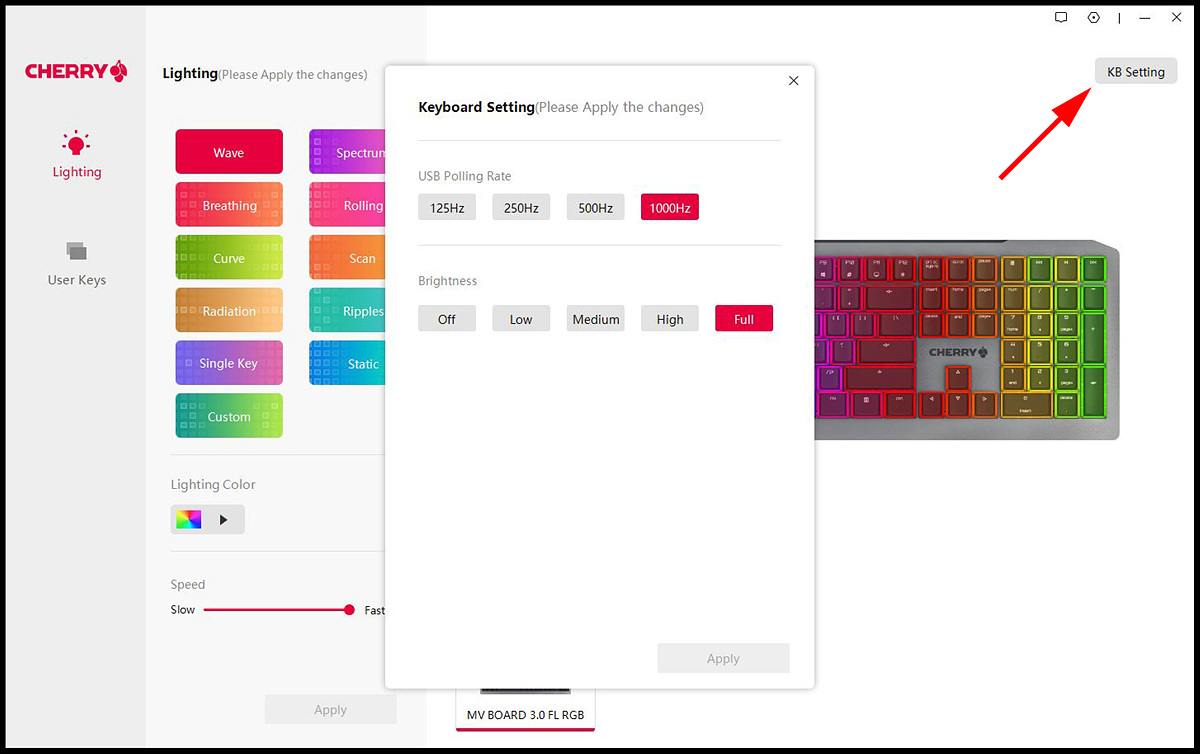 KB 세팅에서는 폴링레이트와 LED 밝기를 설정할 수 있습니다.