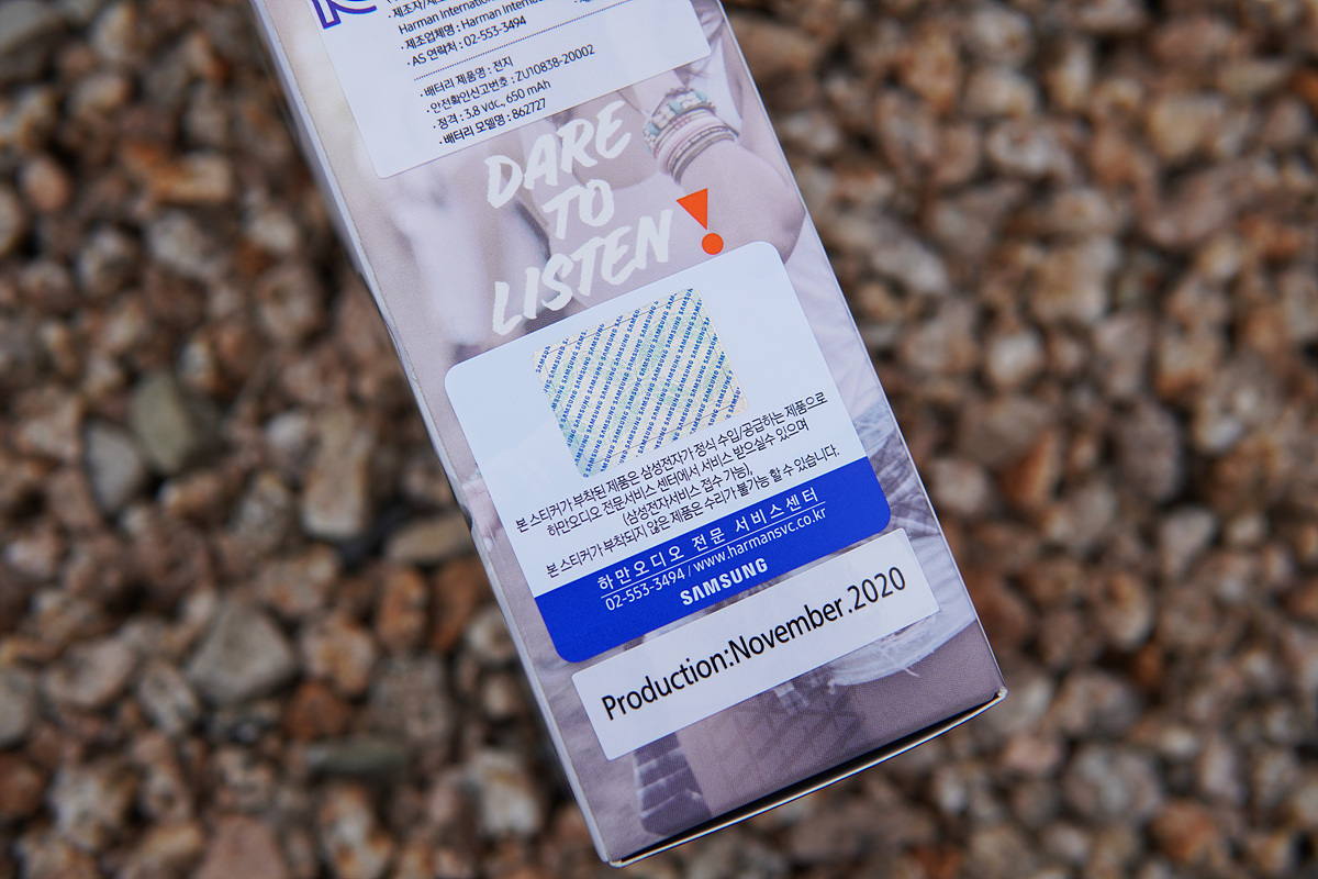 국내 정식 유통 제품임을 확인할 수 있는 홀로그램 스티커가 부착되어 있습니다. 하만, AKG, JBL 브랜드의 고객지원은 삼성전자 서비스 센터가 아닌 하만오디오 전문 서비스센터에서 이루어지므로 홈페이지나 전화로 문의한 뒤 진행을 해야 합니다. (삼성전자 서비스 센터에서 수리가 아닌 접수만 가능합니다.)